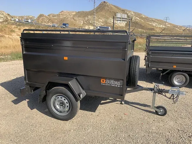 Remolque con un 1 eje de 1,80 x 1,30 con lateral de 80cm y tapa metálica, eje de 1000kg, rueda de repuesto, puerta trasera lateral, etc